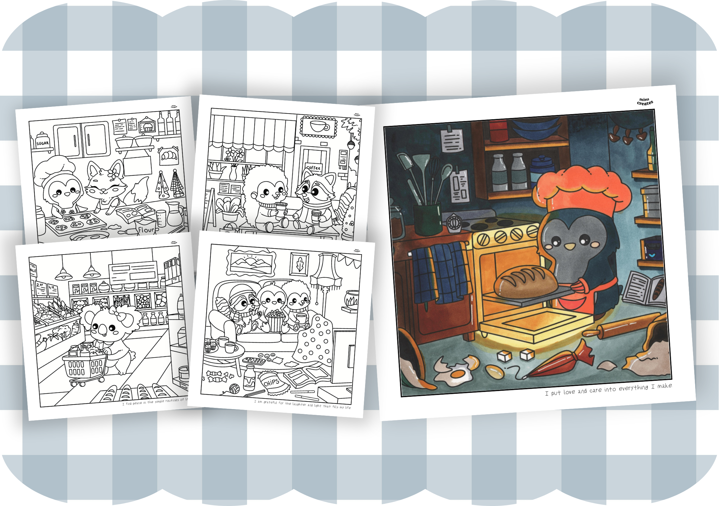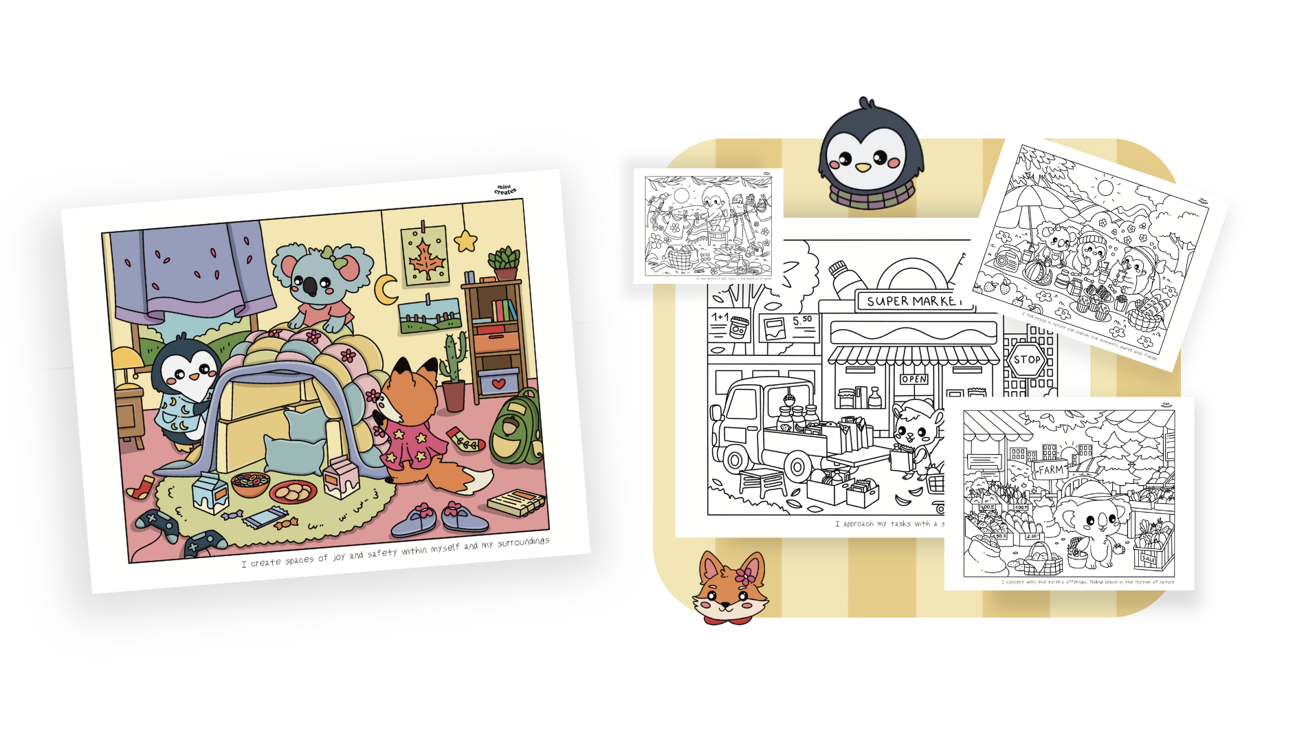 The Cozy Escape Coloring Book offers more than just coloring—it brings you into a world of cozy, relaxing scenes with charming characters. Each page includes a mindfulness phrase, perfect for reflection as you color, allowing you to turn each session into a peaceful meditation.